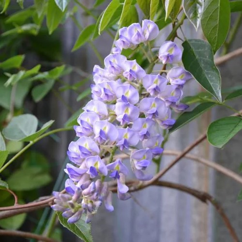 Главная ценность сорта — его цветение. Блю Мун выпускает кисти три раза за сезон: в конце весны, затем летом и нередко повторяет цветение в начале осени. Соцветия крупные, свисающие, длиной 20–30 см, плотные и аккуратно сформированные. Цветки раскрываются постепенно, от верхушки к основанию, создавая живой, динамичный эффект. Окрас — нежный лавандово-голубой, со светлой, почти перламутровой дымкой. Аромат мягкий, тёплый, цветочно-сладкий — выраженный, но не навязчивый, благодаря чему цветущая глициния становится настоящим центром сада.